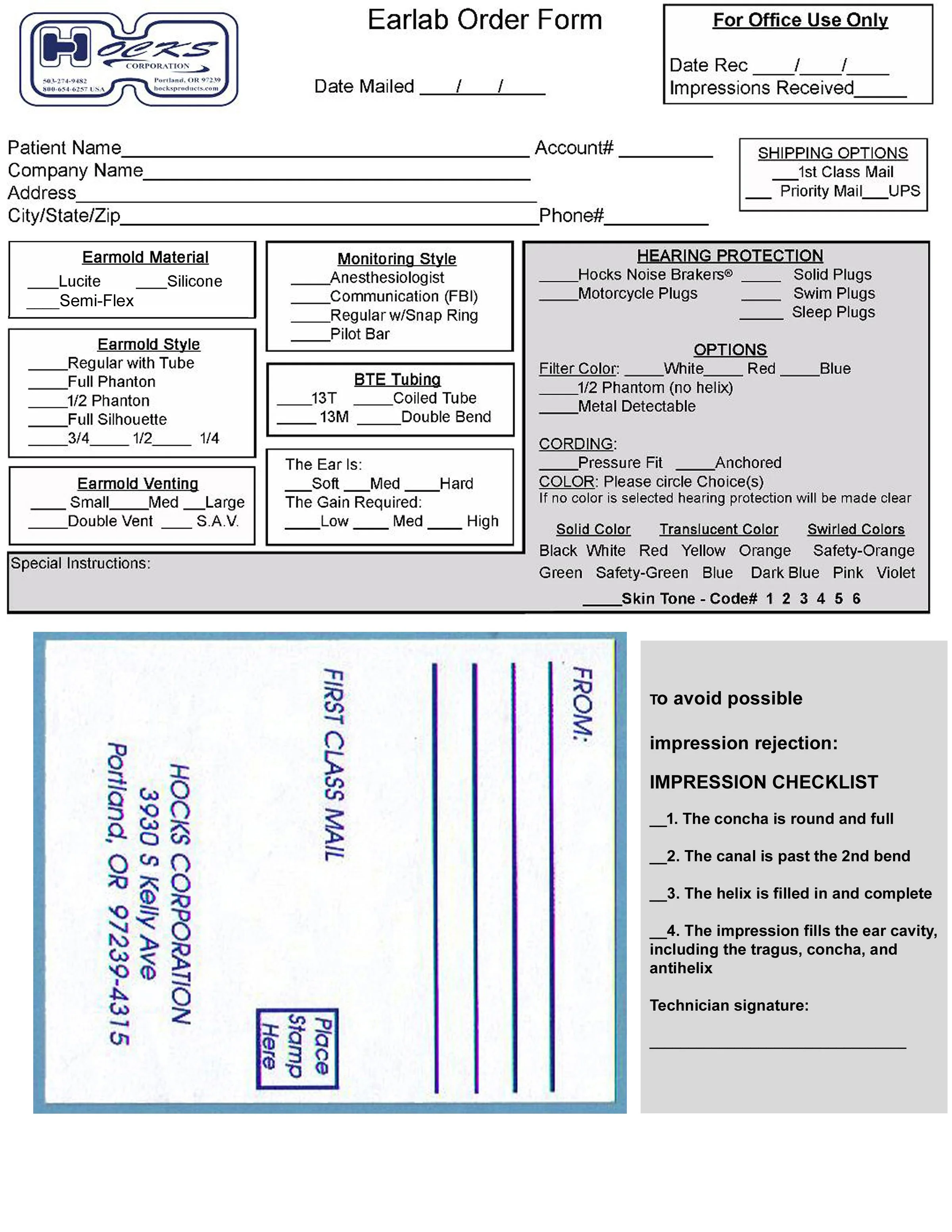 OPEN IN NEW TAB (GOOGLE) TO PRINT. Print both the Impression Guide and the Order Form (pages 1 and 2) and fill in both to send your impressions to Hocks Earlab. Or, contact us to email you the form. 800-654-6257 HOME PAGE